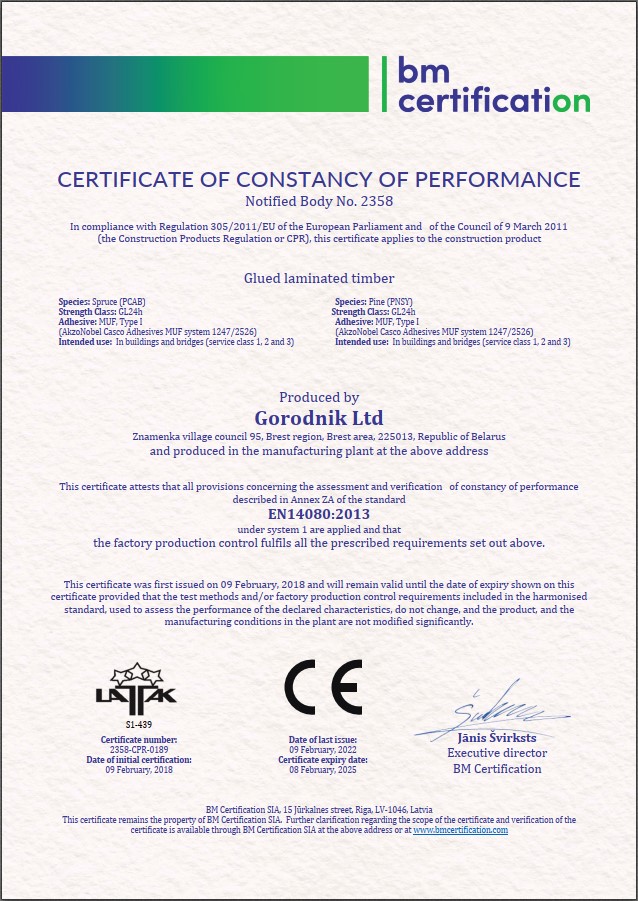 Предприятие в феврале 2018 года было сертифицировано компанией BM TRADA в соответствии с EN 14080: 2013 с классом прочности GL24H для клееного бруса.